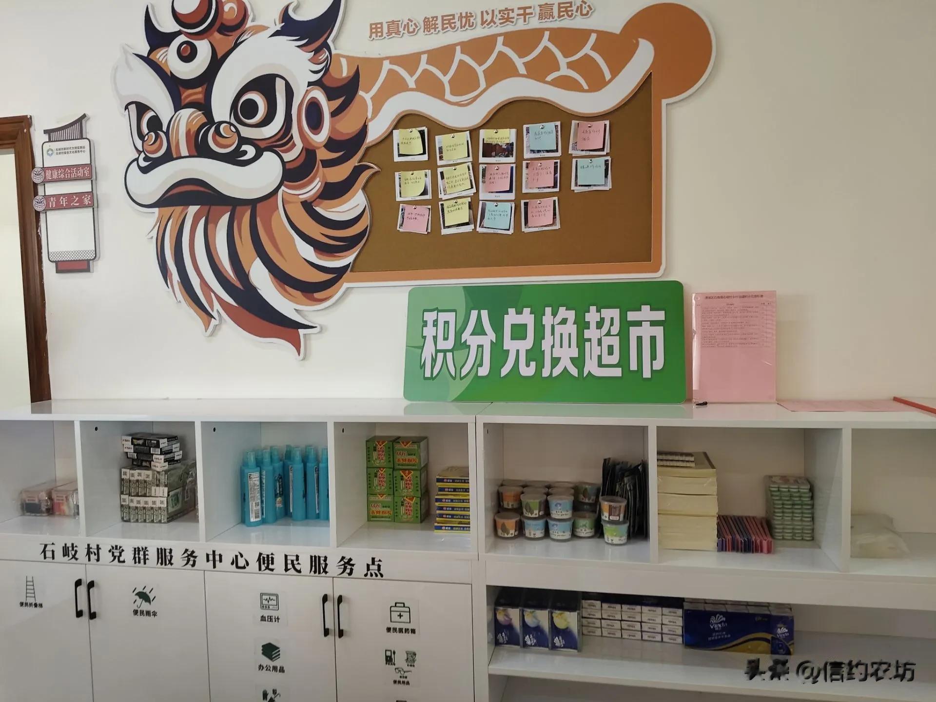 党群服务中心里的:积分兑换超市,妇女儿童之家,农村书屋,就业咨询室等等,都是实实在在的惠民之举。