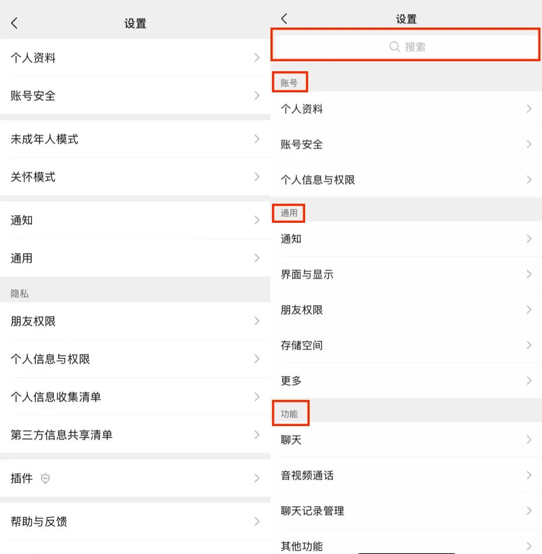 首先在顶部新增了搜索框,你可以直接输入功能名称(如“青少年模式”“聊天背景”)快速直达,不用再在层层菜单里翻找了。