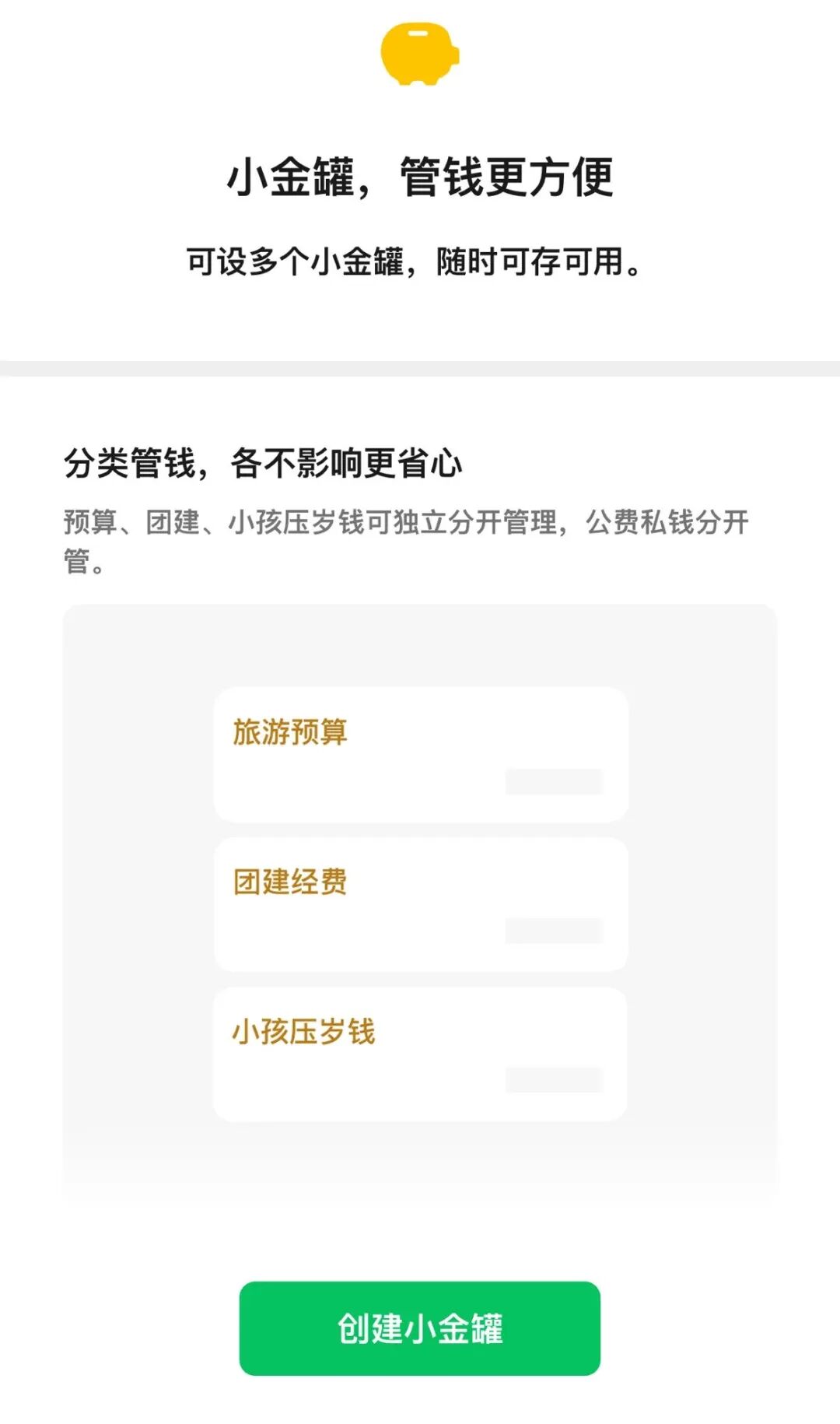 该功能支持创建多个小金罐,随时可存可用,方便记账和分类管理资金,类似支付宝的小荷包,用户可以分别设置旅游预算、团建经费、小孩压岁钱,把不同用途的钱独立分开管理。