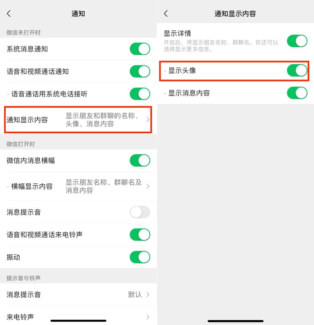 开启路径在:“我” - “设置” -“通知” -“通知显示内容”中,新增了“显示头像”选项。