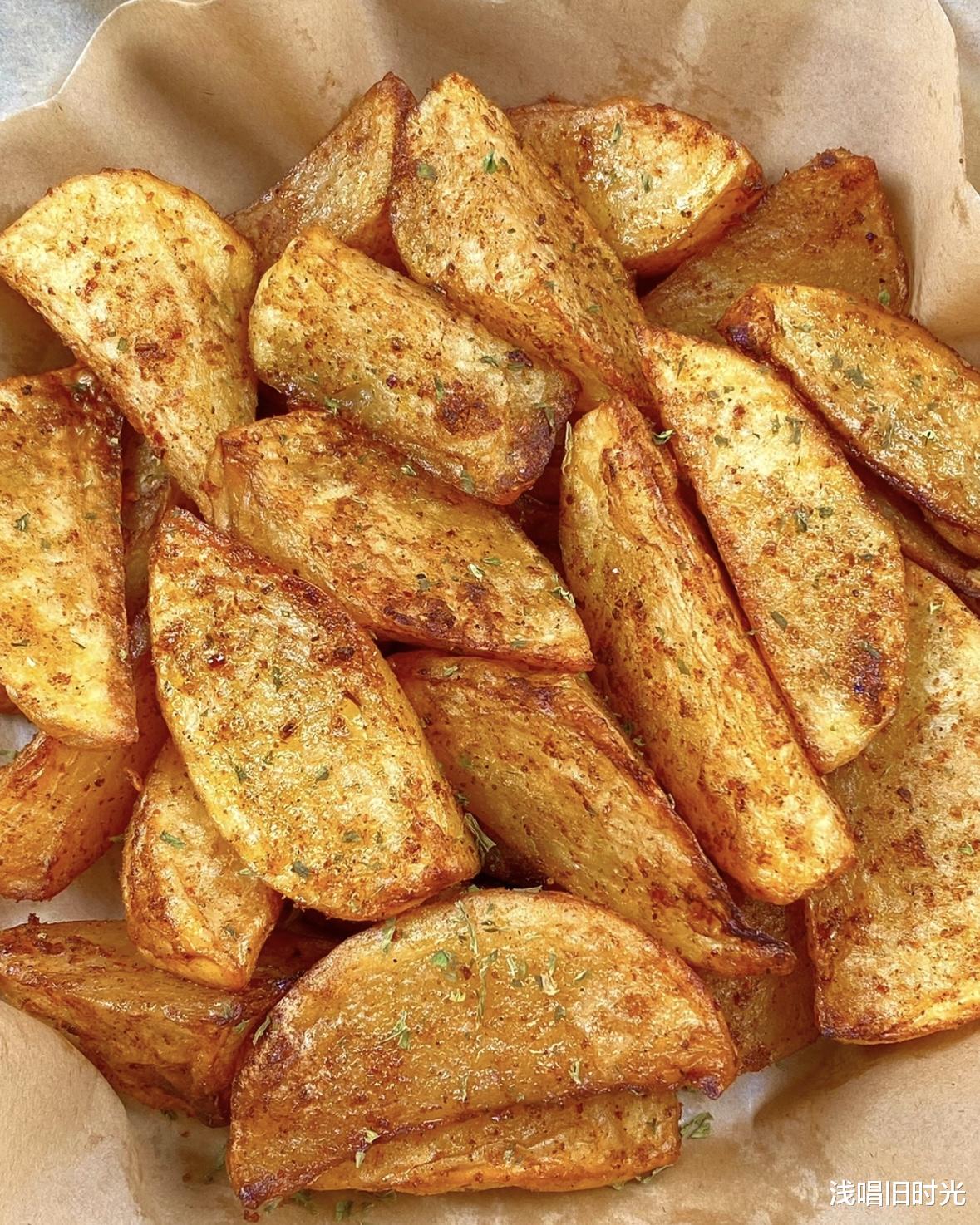 做法:土豆切块,撒辣椒粉+蒜粉,空气炸锅180℃烤15分钟。