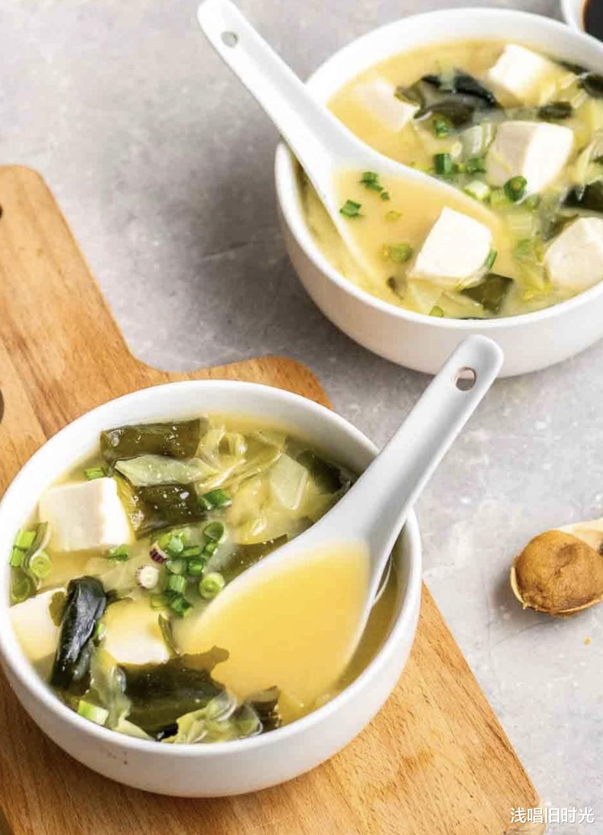 做法:味噌酱+海带+嫩豆腐+葱花,避免添加味精。