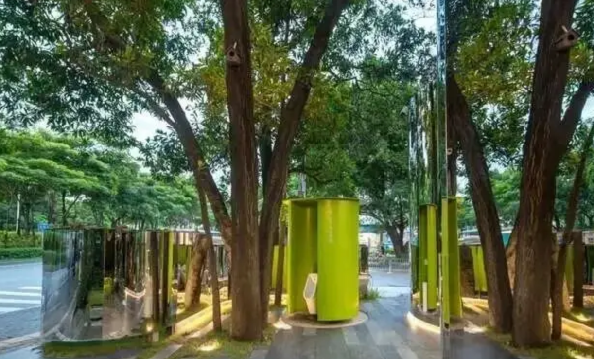 这座没有设置门的儿童公厕,近日通过网友发帖进入公众视野。图片中,绿色柱体紧靠行道树,开放式结构引发讨论。为何要在街头设置这样的设施?又为何不为儿童如厕空间安装一道门?