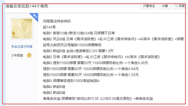 在现有规划中,该玩家的账号矩阵将达到288个角色规模,涵盖老区24组存量账号与新区144个新增账号。支持这一计划的玩家分析,其收益来源主要包括老区稳定的押镖日常收益,以及新区的活动奖励与副本产出,若运气向好,实际收入有望突破2万元的预期目标。