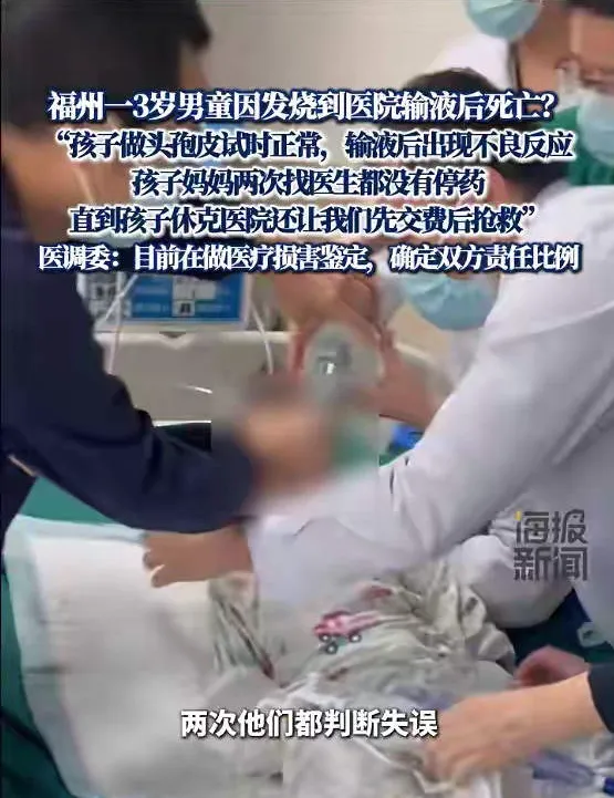 1月5日,福州市一名3岁男童因发烧就医,皮试结果正常,却在输注头孢药物后发生严重反应,最终不幸离世。据孩子父亲回忆,输液开始仅十几分钟,孩子就出现了不良反应。其母曾两次向医护人员求助,但均未停药。更令家属无法接受的是,在情况危急之时,他们得到的指示却是“先去交费,然后才进行抢救”。