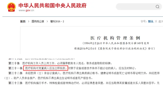 《医疗机构管理条例》第三十一条:医疗机构对危重病人应当立即抢救。对限于设备或者技术条件不能诊治的病人,应当及时转诊。地方上,例如《北京市院前与院内医疗急救衔接工作管理办法(2022年版)》进一步明确院前医疗急救机构和院内医疗急救机构不得因费用问题拒绝或延误对患者的抢救工作。