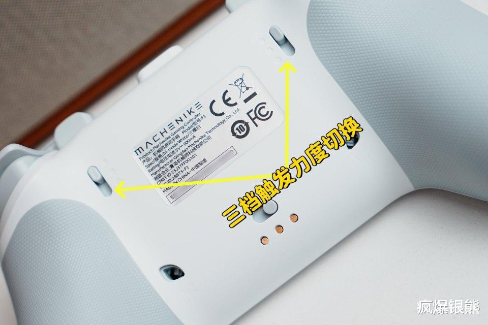 除了以上设计外,F1的扳机键微动更是将性能和竞技水准提升到了新的台阶。通过底部拨动,我们可以在70/90/110gf三档触发力度之间对扳机力度进行调节,让用户在不同游戏上获得不同的触感体验,这个功能我至今还没在别家手柄上见到过。