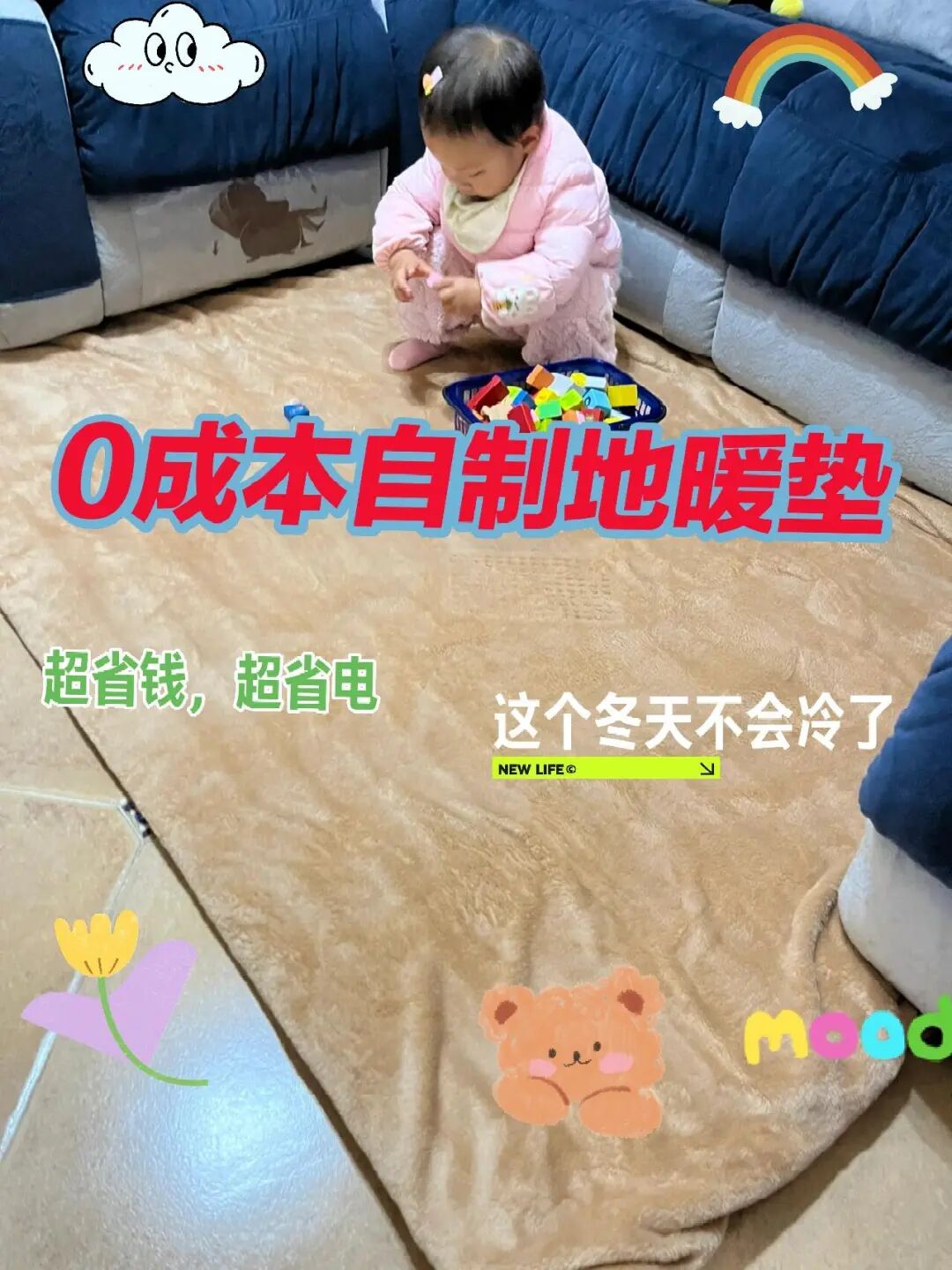 有娃的家庭最愁的就是,孩子总爱趴在地上玩,南方的地板没有地暖,凉得像冰窖,生怕孩子冻着感冒。南方宝妈的低成本取暖地垫,直接解决这个难题。