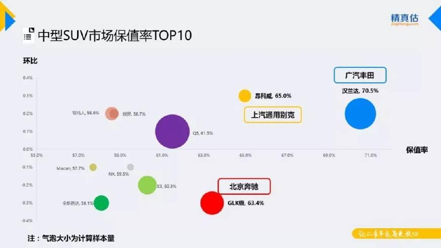 中型SUV市场保值率TOP榜单中排名保持稳定,汉兰达、昂科威、GLK依旧稳居前三。GLK和全新胜达保值率环比下降幅度相对较大,但并未影响本次排名。自主品牌集体消失。