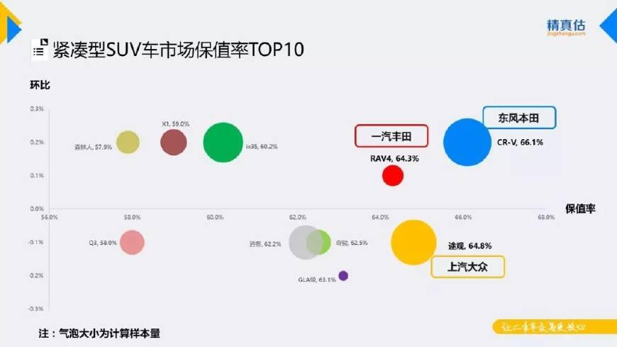 紧凑型SUV TOP榜单中,保值率排名也还算稳定,CR-V保值率依旧稳居保值率第一,老大位置无人撼动。途观、RAV4保值率继续分列二、三位。唯一的豪华品牌宝马旗下的X1来到第八位。CR-V基本上是出一辆卖一辆的节奏。