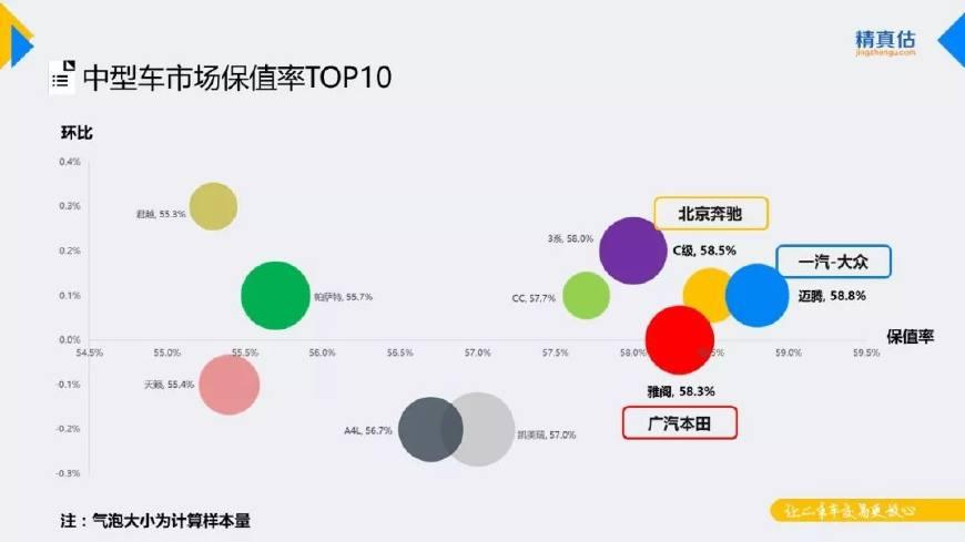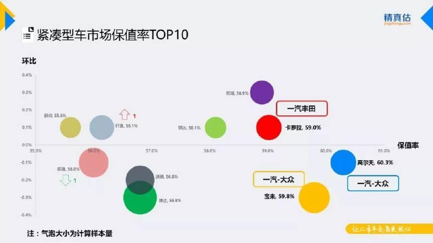 紧凑型车市场仍是大众一家独大:高尔夫、宝来、卡罗拉位居保值榜前三甲。思域新车市场表现突出,车辆保值率环比上升幅度相对较大,保值率紧跟卡罗拉稳定排名第四。美系车没有车型入榜,这个区间内还是买大众靠谱一些。