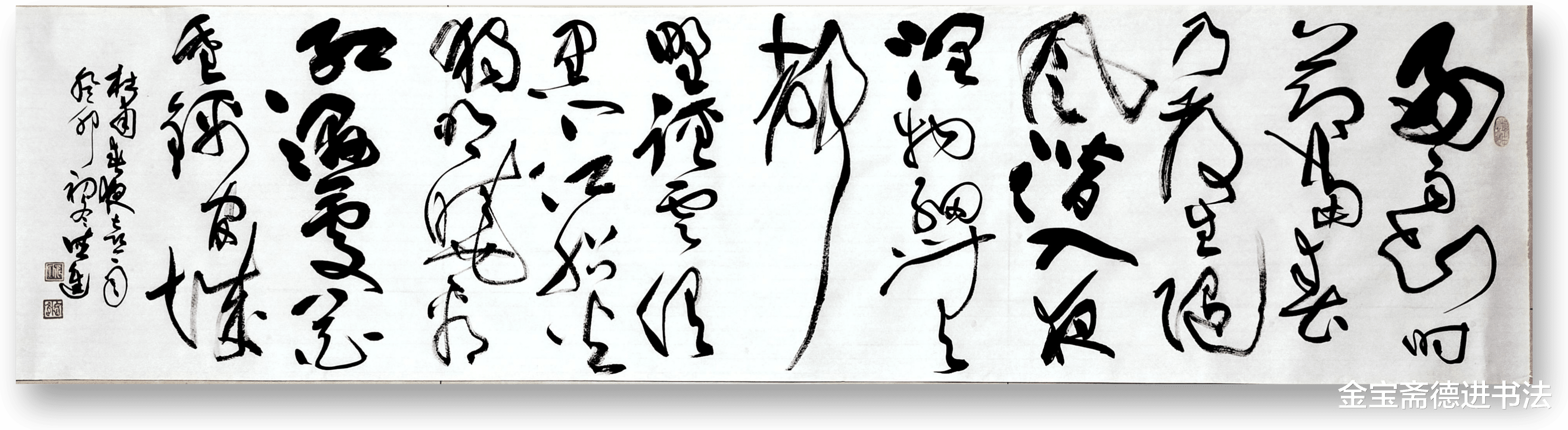 两作相融,竖幅的苍劲与横幅的灵动相映成趣。秋雨的疏朗洗练春雨的绵密,春潮的生机滋养秋山的静谧,笔墨间既有草书 “骤雨旋风” 的酣畅,又含 “随风潜入夜” 的细腻。纵横交织的线条,既是自然雨景的艺术再现,亦是唐宋诗心与草书风骨的完美契合,让雨意贯通古今,在笔墨间流淌出中华文脉的悠长韵味。