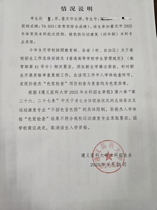 重庆体育特长生孙某某以文化课502分、体育专业87分的成绩被遵义医科大学运动康复专业录取,其高考体检报告由合川区人民医院出具,明确标注“色觉正常”。然而,入学十余天后,学校三次复查均判定其“色觉异常”(色弱)。因该校招生章程规定运动康复专业“不招色盲色弱”,孙某某被退学,被迫复读。家长痛心表示,若高考体检准确,绝不会选择该专业。