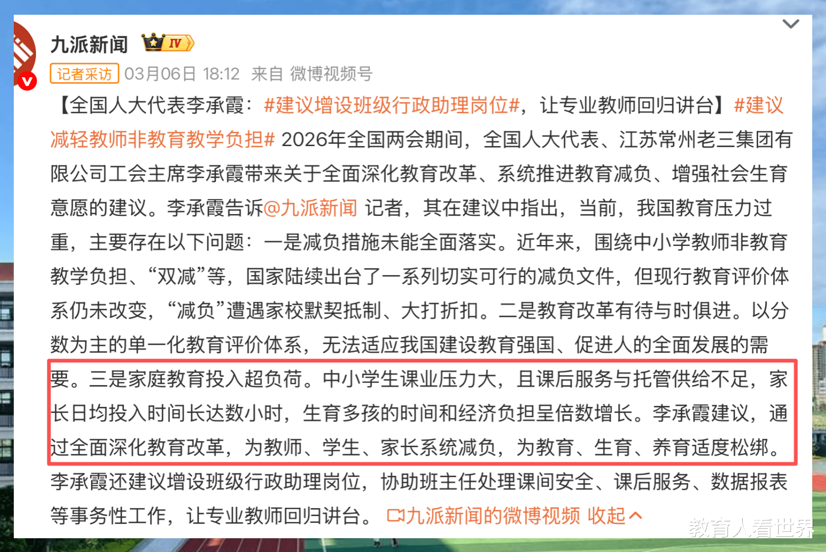 近日,全国人大代表李承霞提了个“教师减负”建议,瞬间点燃全网:在中小学增设“班级行政助理”,把安全管理、数据报表、课后服务这些杂活儿从班主任手里扒拉出来,让老师能真正站上讲台。