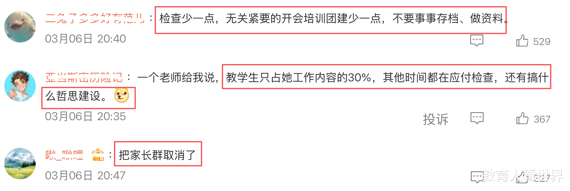 建议一出,评论区直接炸了锅。有人直言不讳:“教书只占工作内容的30%,剩下70%都在搞哲思建设、拍视频打卡。”还有人更扎心:“检查少一点,开会少一点,不要事事存档做资料”、“把家长群关了,学校公众号关了”……
