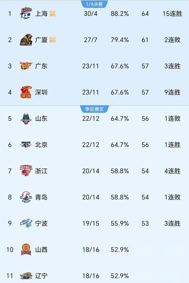 广东靠着这波三连胜拿到57分,硬生生把北京挤下去重回第三。