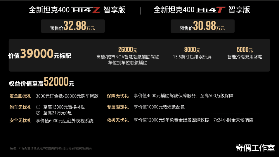 目前全新坦克400 Hi4-Z智享版、全新坦克400 Hi4-T智享版已同步开启预售,预售期间预订可享6重尊崇权益,全新坦克400以满满诚意为年轻用户体验潮酷越野带来惊喜购车优惠。