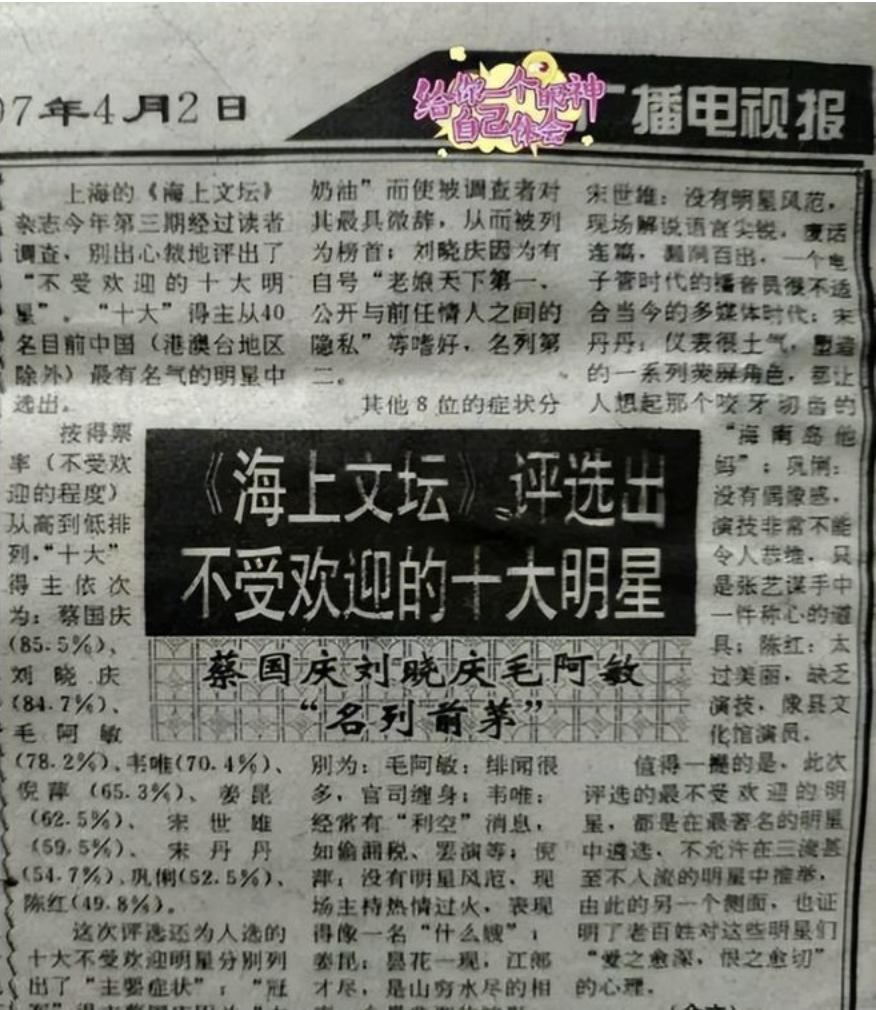 考古到1997年发布的一篇趣闻,杂志《海上文坛》别出心裁地策划了一期专题,根据读者调查评选出“最不受欢迎的十大明星”。