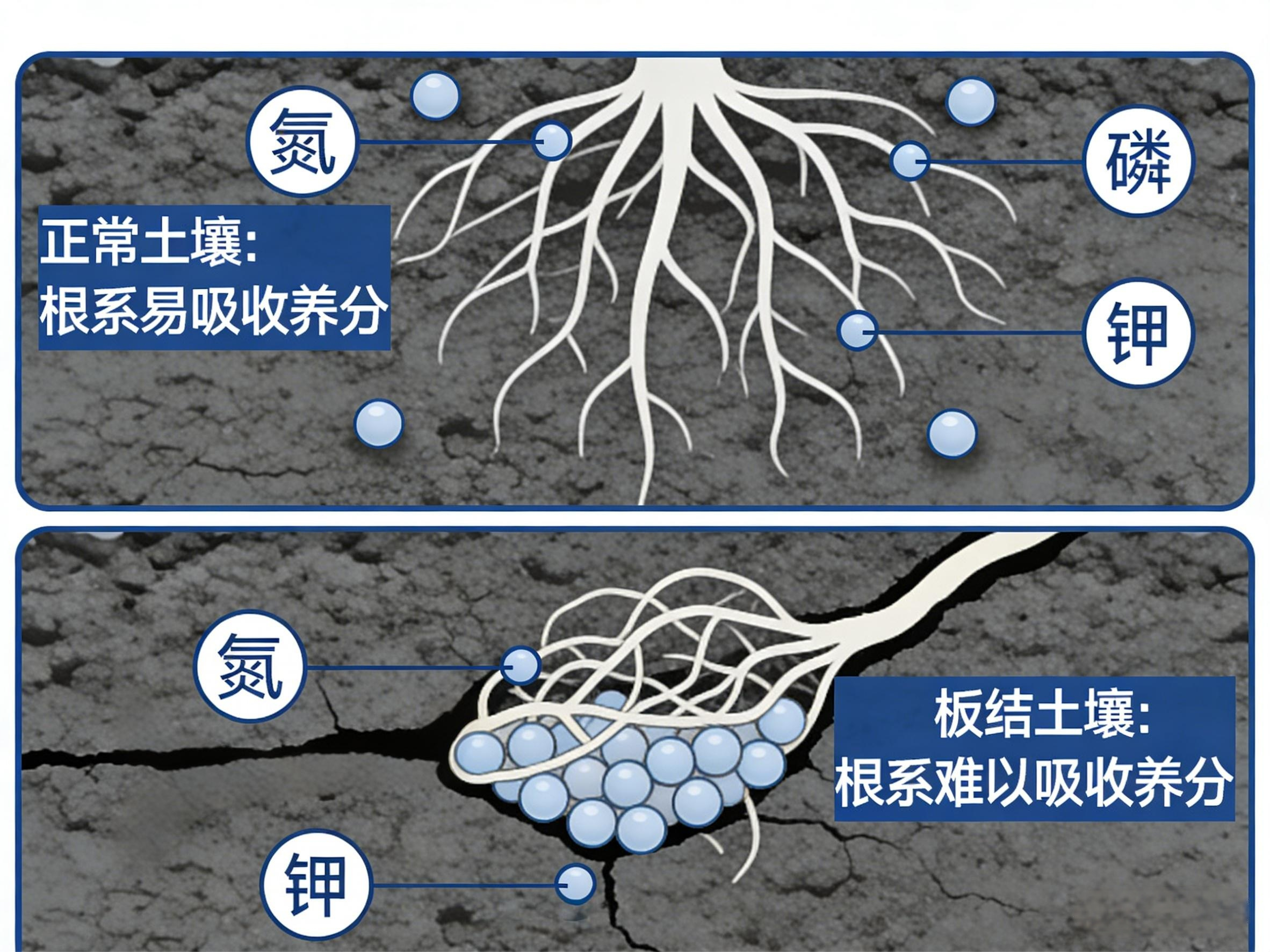 尤其是土壤板结、酸化,或者低温天气的时候,作物的根系活性差,根本吸不动土壤里的氮磷钾——你施得越多,土壤里的肥料堆积越多,反而会烧根、烂根,让作物长得更弱,形成“越施越弱、越弱越施”的恶性循环!