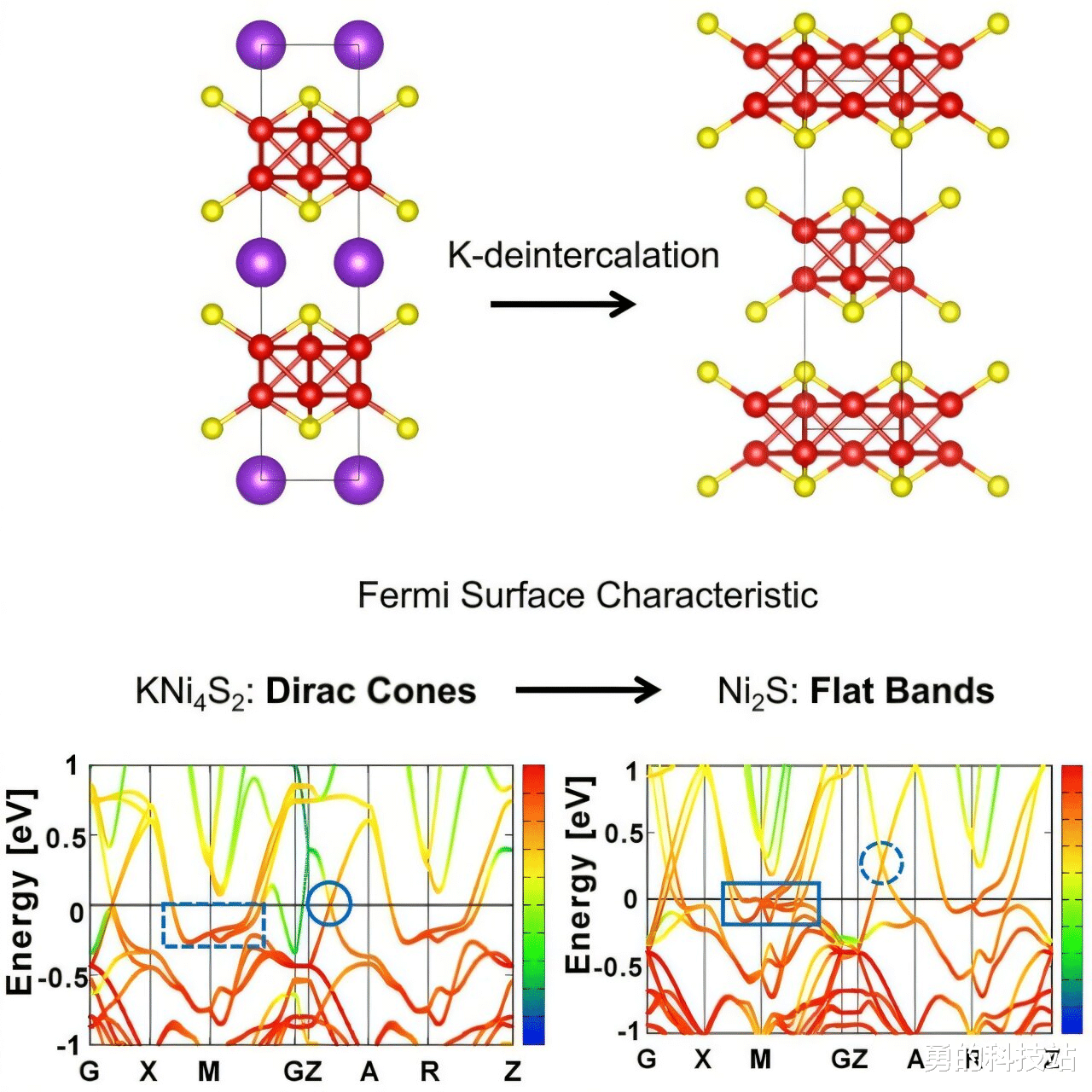 顶部:KNi4S2的结构。左图:钾原子(K)、镍原子(Ni)和硫原子(S),分别以紫色、红色和黄色表示。右:去除K原子。底部:状态之间的过渡,高亮平坦带(方形)和狄拉克锥(圆圈)。图片来源:赵恒迪。