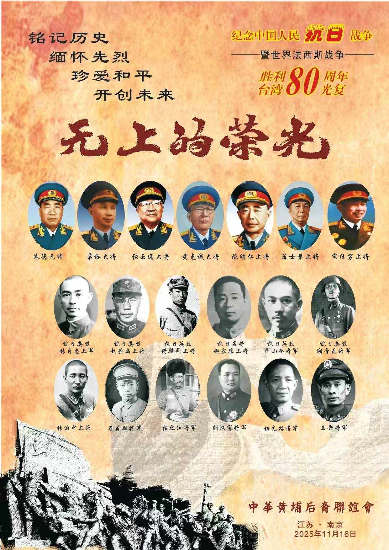 黄埔军校承载着两岸同胞共同的历史记忆与深厚民族情感,是中华民族近代史上具有重要象征意义的精神坐标。2025年适逢中国人民抗日战争暨世界反法西斯战争胜利八十周年、台湾光复八十周年,中华黄埔后裔联谊会于2025年11月中旬在南京举办《纪念中国人民抗日战争暨世界反法西斯战争胜利八十周年、台湾光复八十周年》主题大型纪念活动。