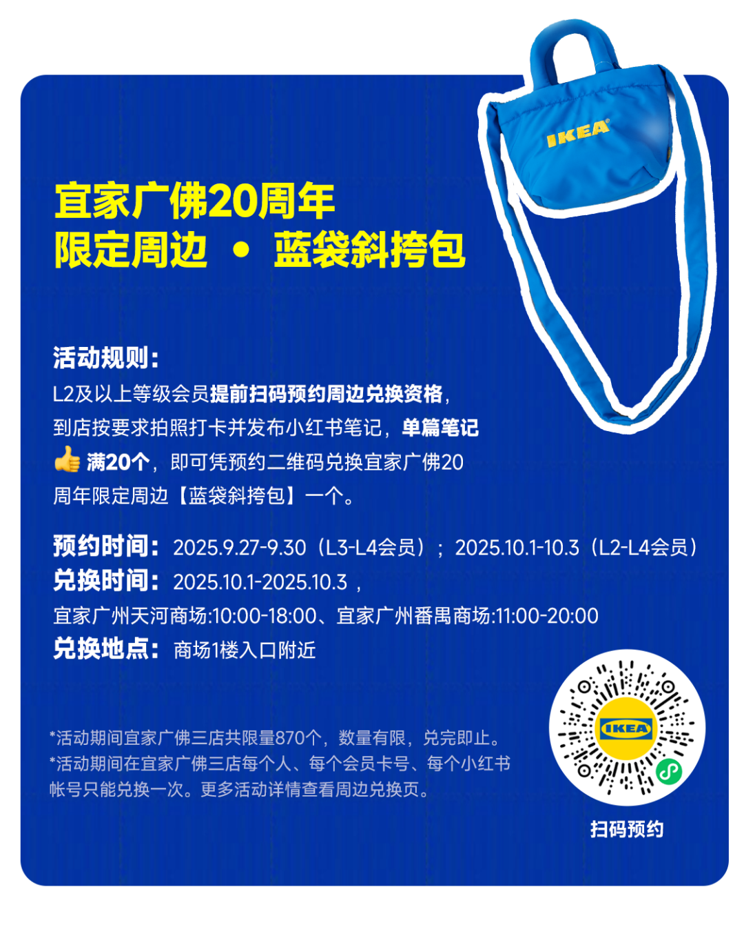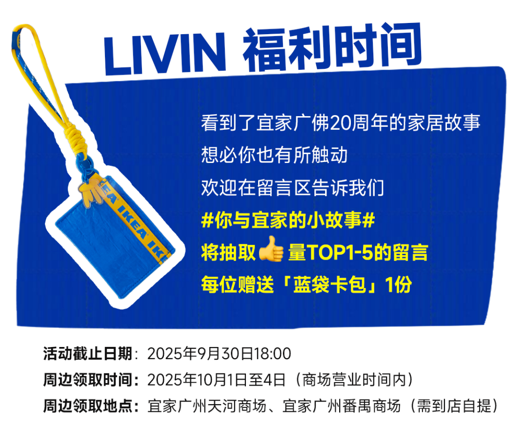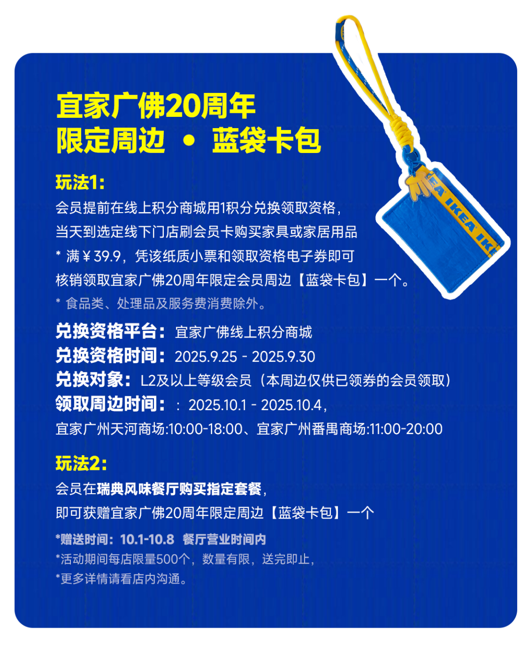 令人惊喜的是,宜家广佛以「廿年相伴 家是答案」为主题计划推出多达六轮的会员限定周边,这次的卡包和斜挎包只是第一波哦,收集控们记得持续关注宜家在11.11、春节等活动节点的活动信息。