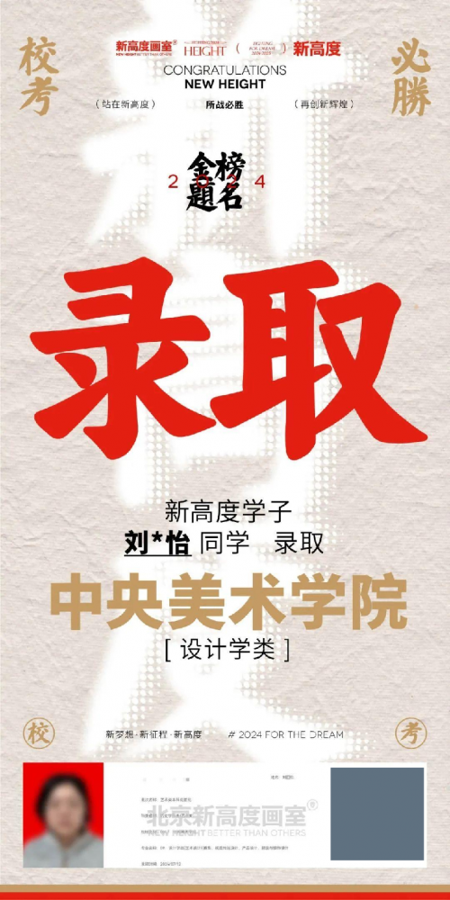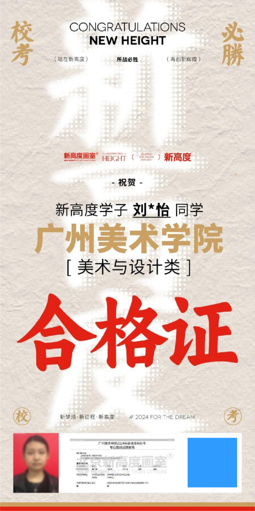 回望备考之路,每一步都凝聚着汗水与努力,能够应届上央美实现这遥不可及的梦想,每一步都离不开新高度老师们的悉心指导与付出!谢谢老师,同时也要谢谢父母对我无私的支持!