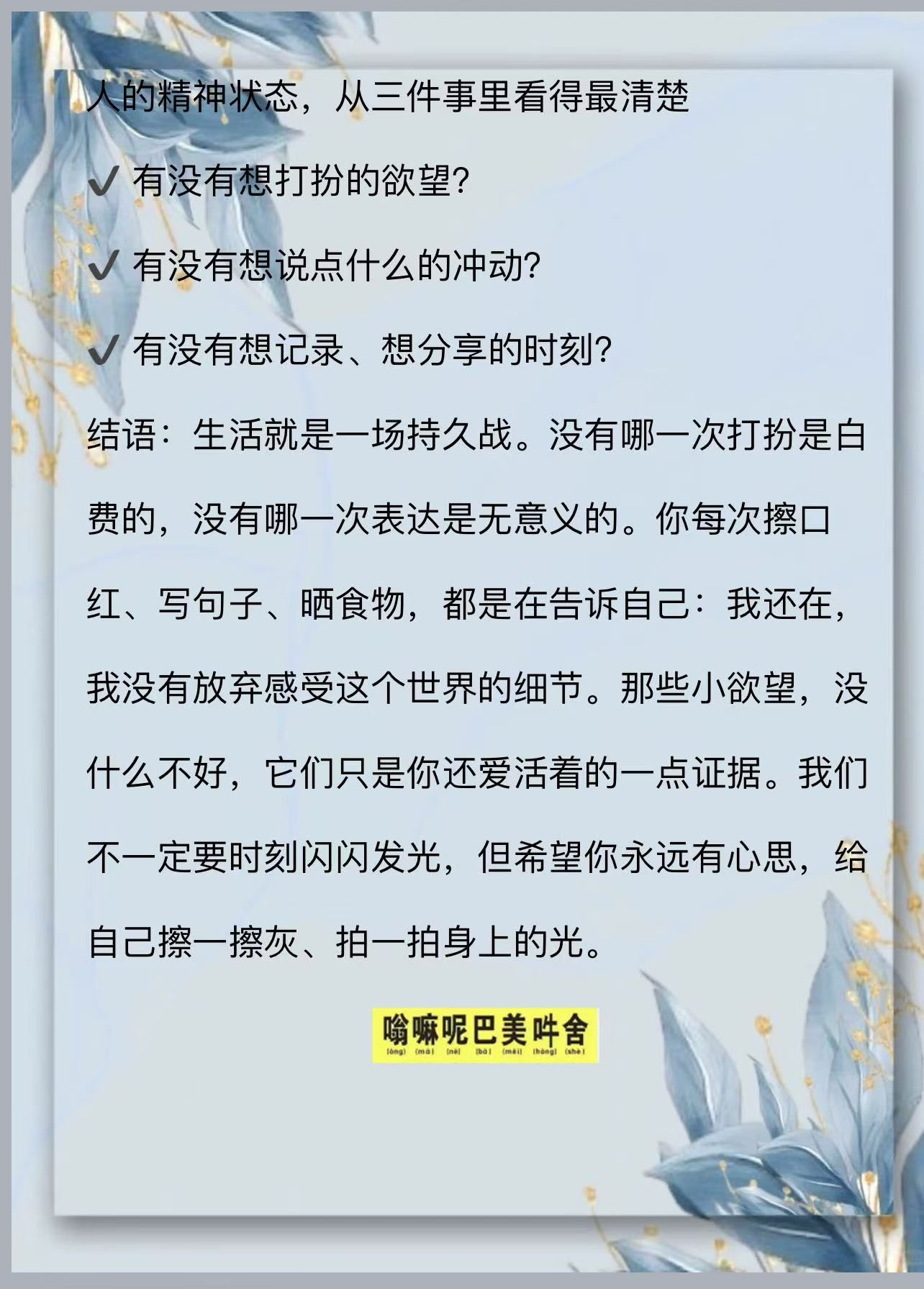 生活就是一场持久战。没有哪一次打扮是白费的,没有哪一次表达是无意义的。你每次擦口红、写句子、晒食物,都是在告诉自己:我还在,我没有放弃感受这个世界的细节。
