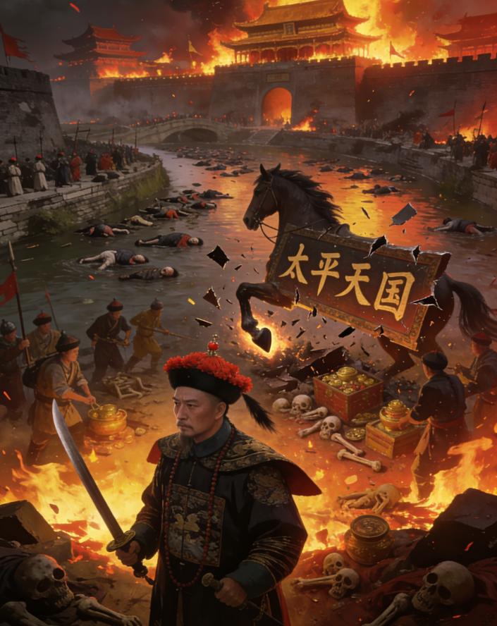 他看到满城的尸体,横七竖八地堆在街道上。他看到太平军的残兵败将,有的在巷战,有的在自焚,有的跪在地上求饶。他看到洪秀全的天王府,金碧辉煌的宫殿,此刻已经化为一片火海。