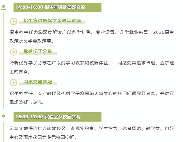每天下午2点到4点,广以会有招生宣讲,老师会详细讲办学特色、专业设置、招生政策,还有大家最关心的奖学金;另外还有优秀学子分享学习经历,以及招生办主任、专业教授和学子一起的圆桌答疑,有任何疑问都能当场问清楚。