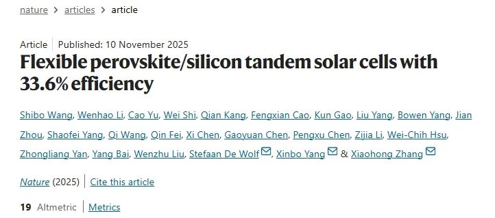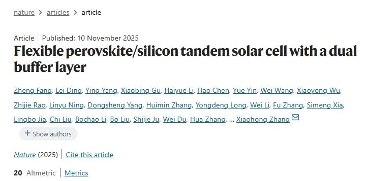 11月10日同一天,《自然》发表了两篇来自中国科研团队的突破性研究。它们像一对“双子星”,共同将柔性钙钛矿/硅叠层太阳能电池推向了兼具超高效率、极致柔韧和非凡稳定的全新高度。这两项工作的共同通讯作者、苏州大学的张晓宏教授领衔的团队,与合作伙伴们从不同路径出发,殊途同归,为解决同一个世界性难题提供了完美的“中国方案”。