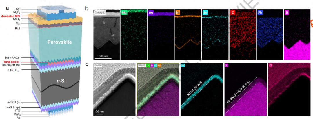 图说:高效钙钛矿/硅叠层太阳能电池的器件结构(a)、微观结构与元素分布(b、c)
