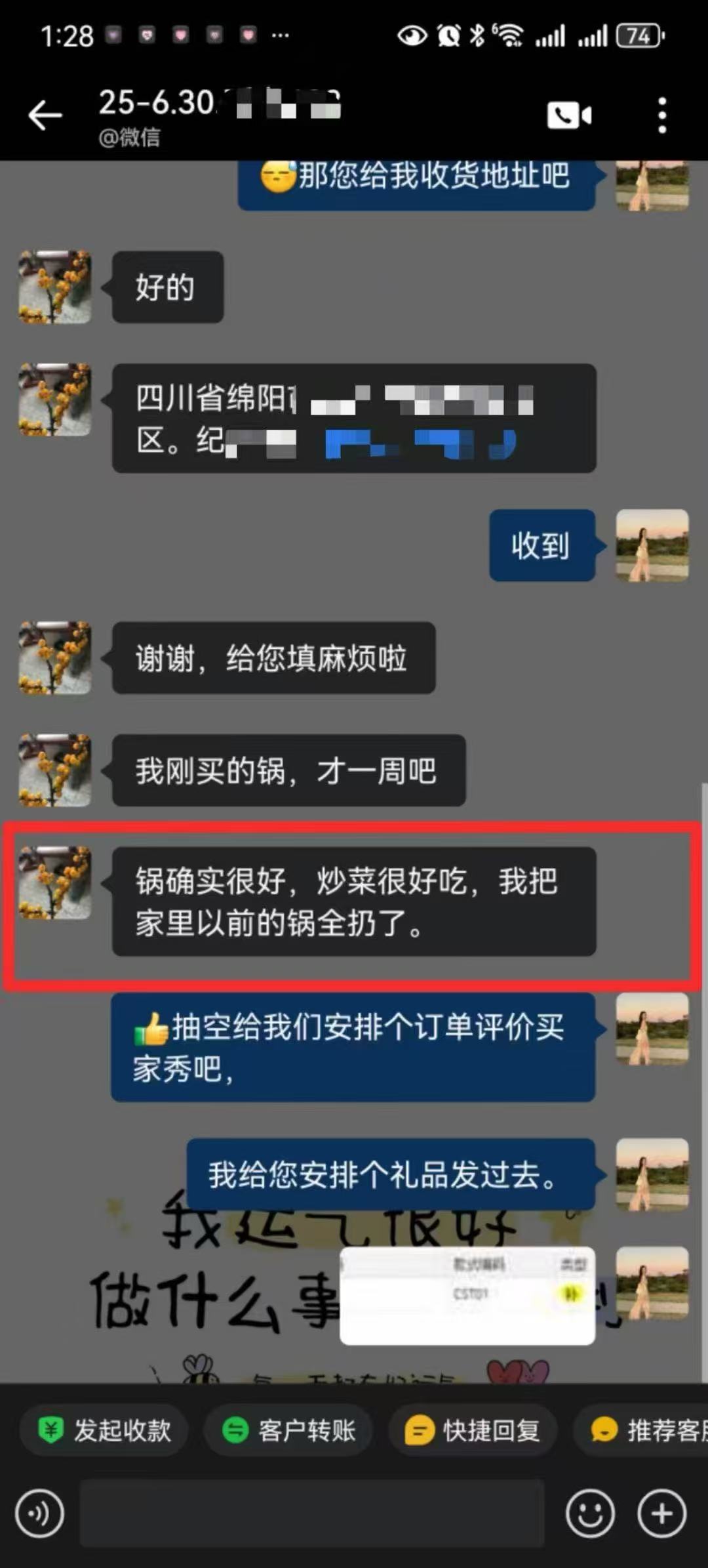 客户说好才是真的好!“这锅确实好!炒菜太香了,家里其他锅直接下岗!”来自老客户英姐的真实反馈"说实话,刚开始我对这种无涂层铁锅是持怀疑态度的。"。"经过正确的开锅养护后,匠合锤铁锅展现出了惊人的不粘性能,煎鱼不破皮,炒饭不粘锅,而且越用越顺手。