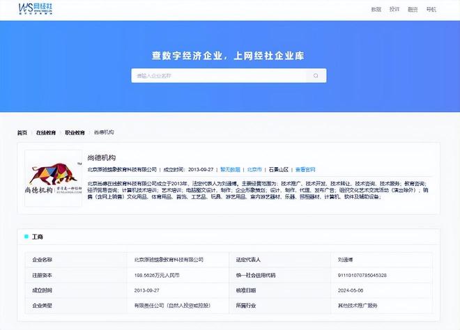 据网经社企业库显示,“尚德机构”属于北京原驰蜡象教育科技有限公司,成立于2013年9月27日,法定代表人为刘通博。