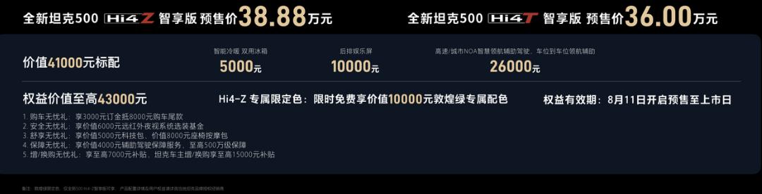 8月11日,长城全新坦克500智享版开启预售,两个版型预售价分别为: