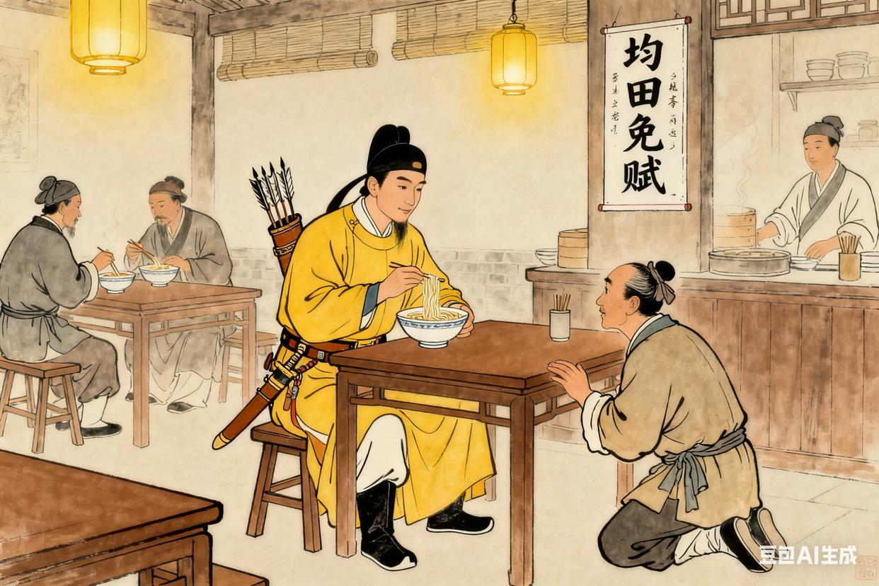崇祯十七年正月,西安城里的年味还没散。李自成在西安称帝,国号大顺,改元永昌。登基那天,他穿着龙袍,走到殿外,看着下面跪着的大臣和百姓,忽然有点恍惚 —— 他从一个没饭吃的驿卒,变成了皇帝,这一路走得太不容易了。他让人把 “均田免赋” 的政策写进法令,还让人去各地清查土地,分给百姓。有天他微服出巡,见街上的店铺都开着门,百姓们有说有笑,心里很高兴。他走进一家面馆,要了碗面,老板认出了他,赶紧磕头,他扶起老板说:“老板,不用这样,我就是来吃碗面,跟大伙儿一样。”