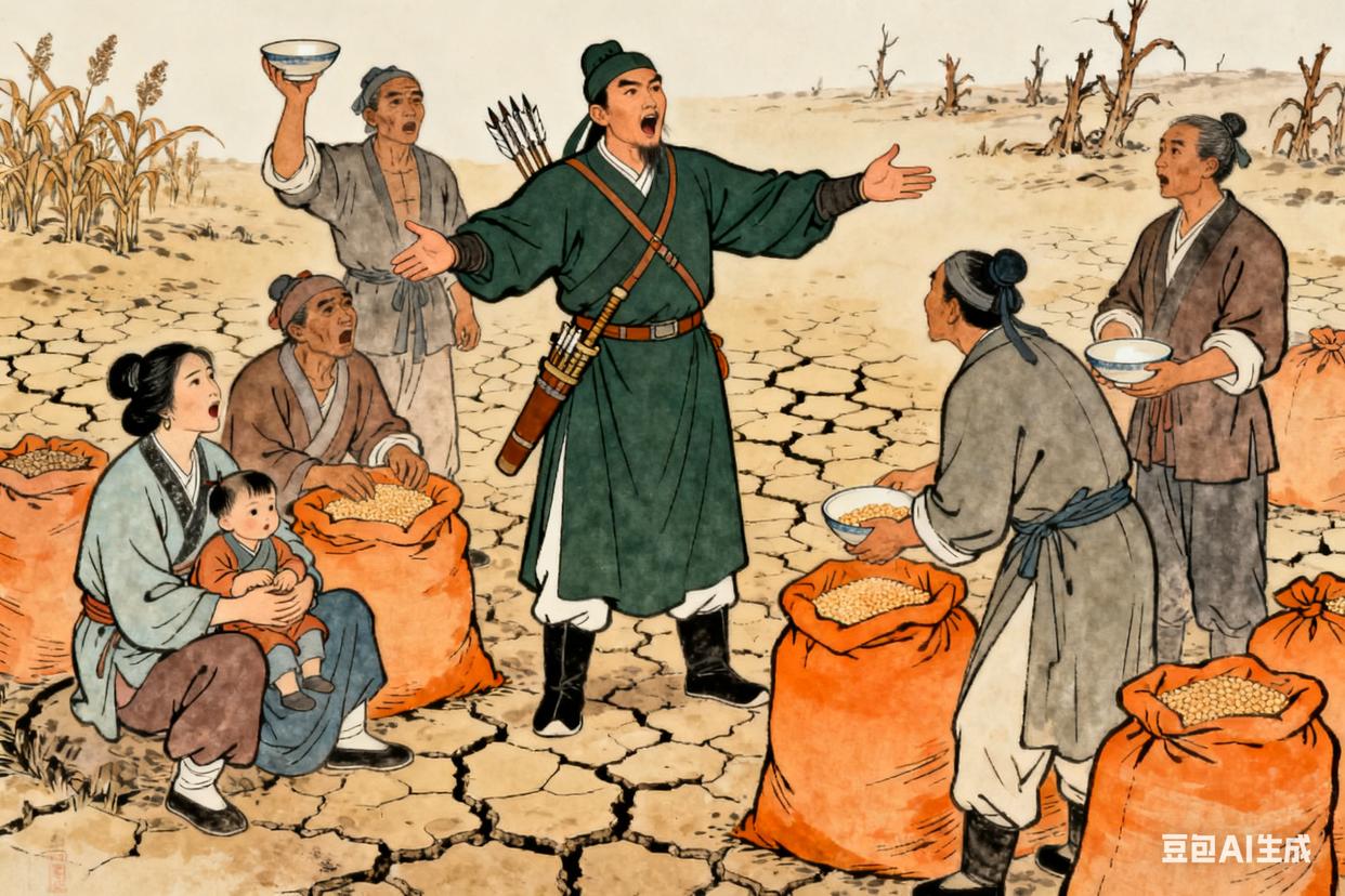 崇祯十三年冬天,河南大旱,地里的庄稼都枯死了,到处都是逃荒的人。李自成带着队伍进了河南,走到一个村子,见村民们吃的是树皮和观音土,有个小孩饿得直哭,手里攥着个空碗。他心里一酸,让人把队伍里的粮食拿出来分给村民。有个老农问他:“将军,以后咱们能有饭吃吗?能不用交那么多租吗?” 他想了想,大声对村民们说:“咱们以后‘均田免赋’!有地大家种,有饭大家吃,再也不让地主和贪官欺负咱们!” 村民们愣了愣,然后有人喊 “好”,接着更多人跟着喊,声音在空旷的田野里飘得很远。