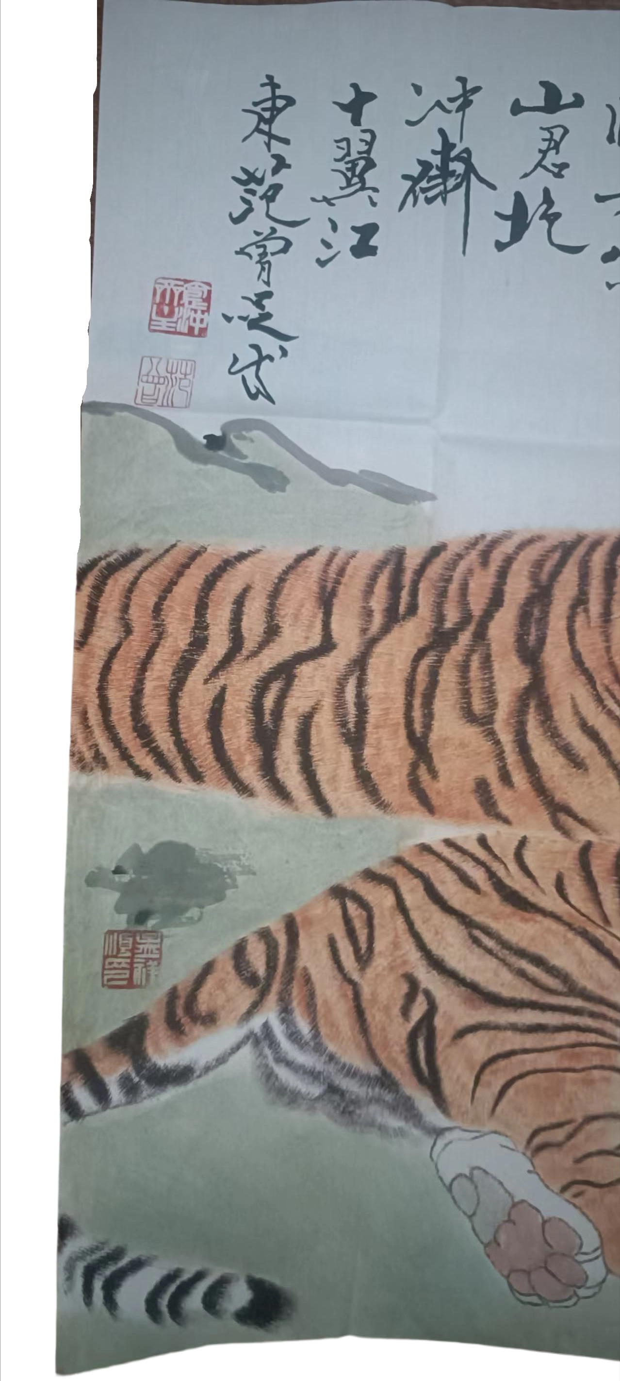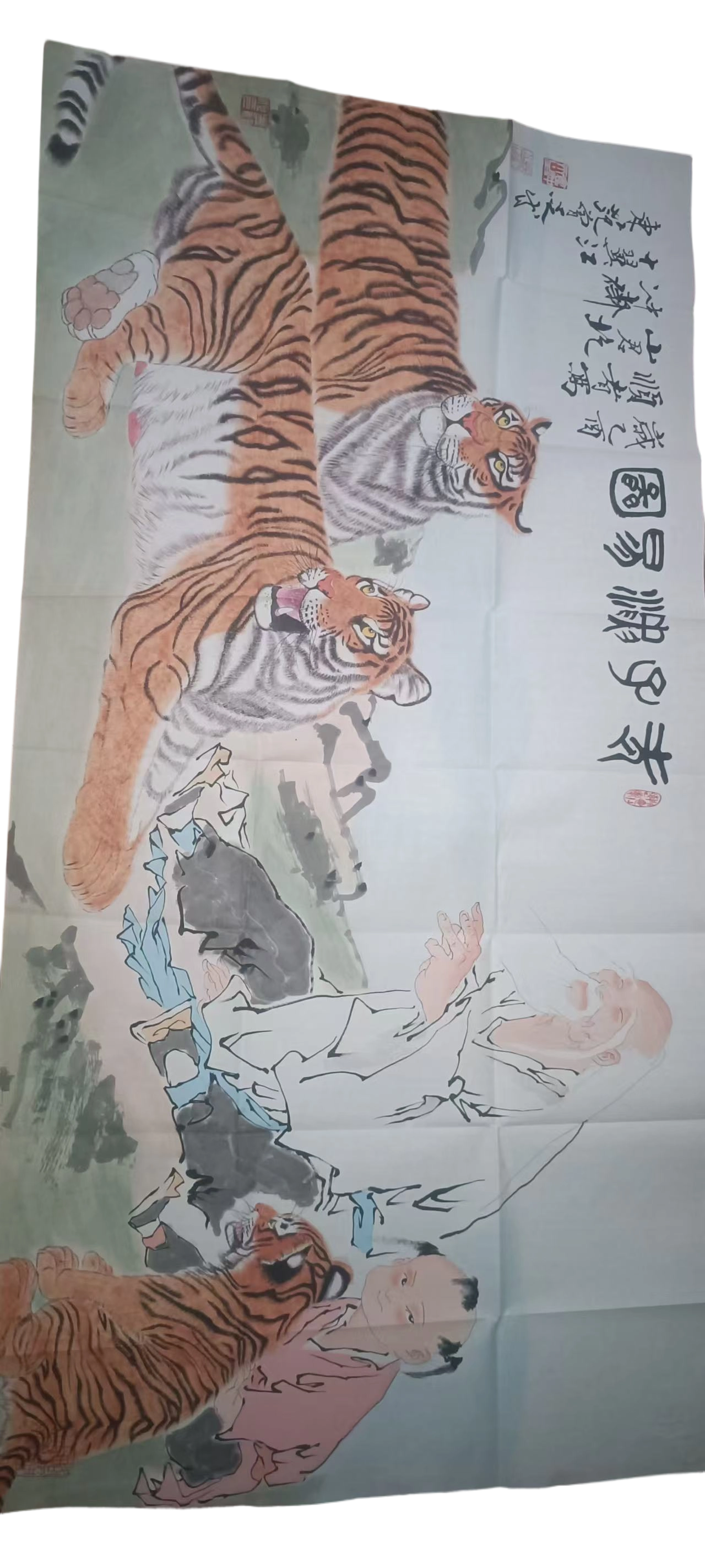 从艺术技法观之,这幅画是传统国画 “工写结合” 的精妙实践:老虎的斑纹以工笔细绘,毛发根根分明,尽显写实功底;老子的衣袍、山石的晕染则用写意笔法,寥寥数笔便勾勒出飘逸感与空间层次。这种技法的融合,既保证了形象的辨识度,又传递出中国书画 “形神兼备” 的审美追求。