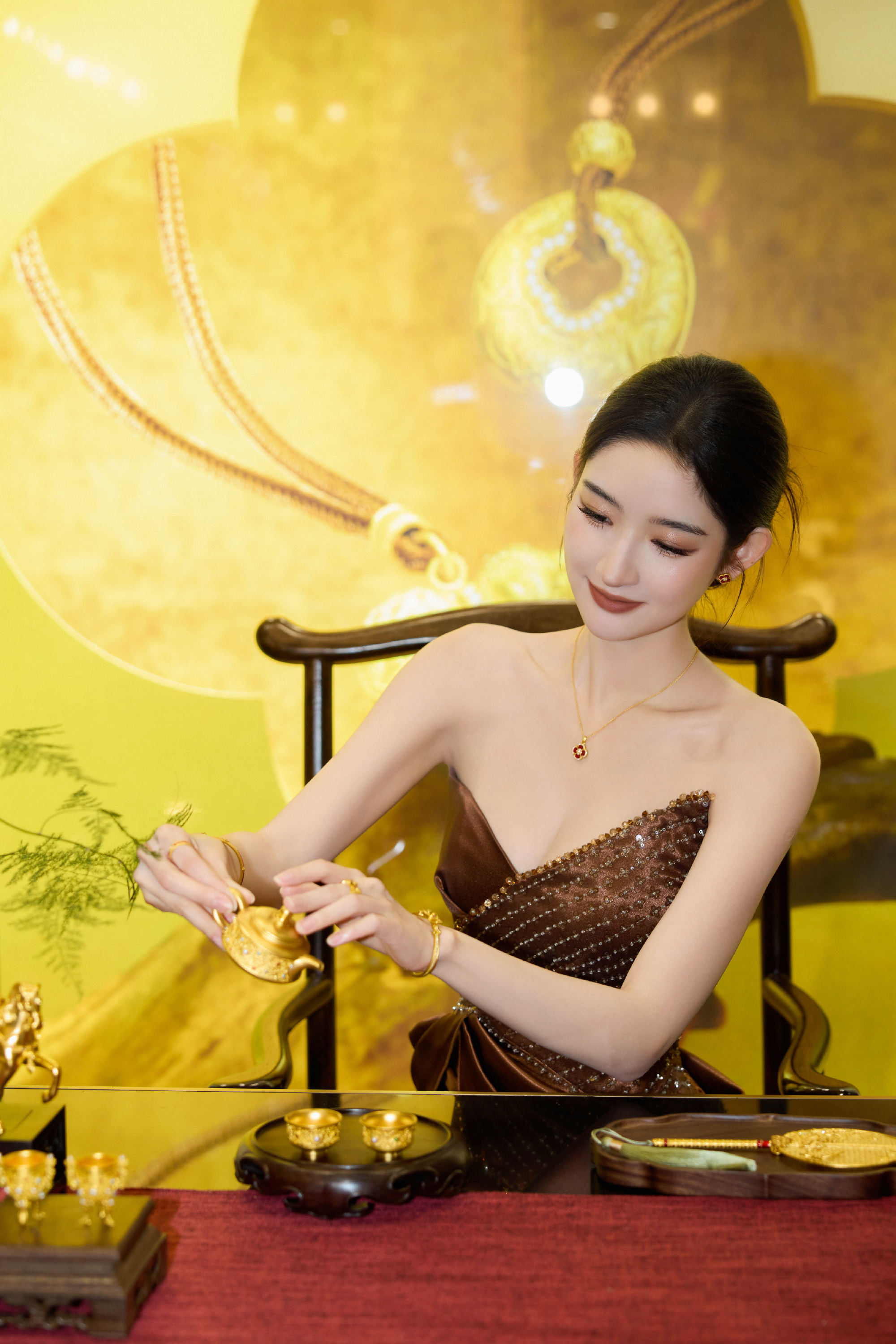 双手轻托一方鎏金印玺,腕间金镯、耳间红宝相映成辉,利落盘发衬得肩颈线条愈发流畅,眉眼间的沉静气场,藏着不张扬的奢华与底蕴。