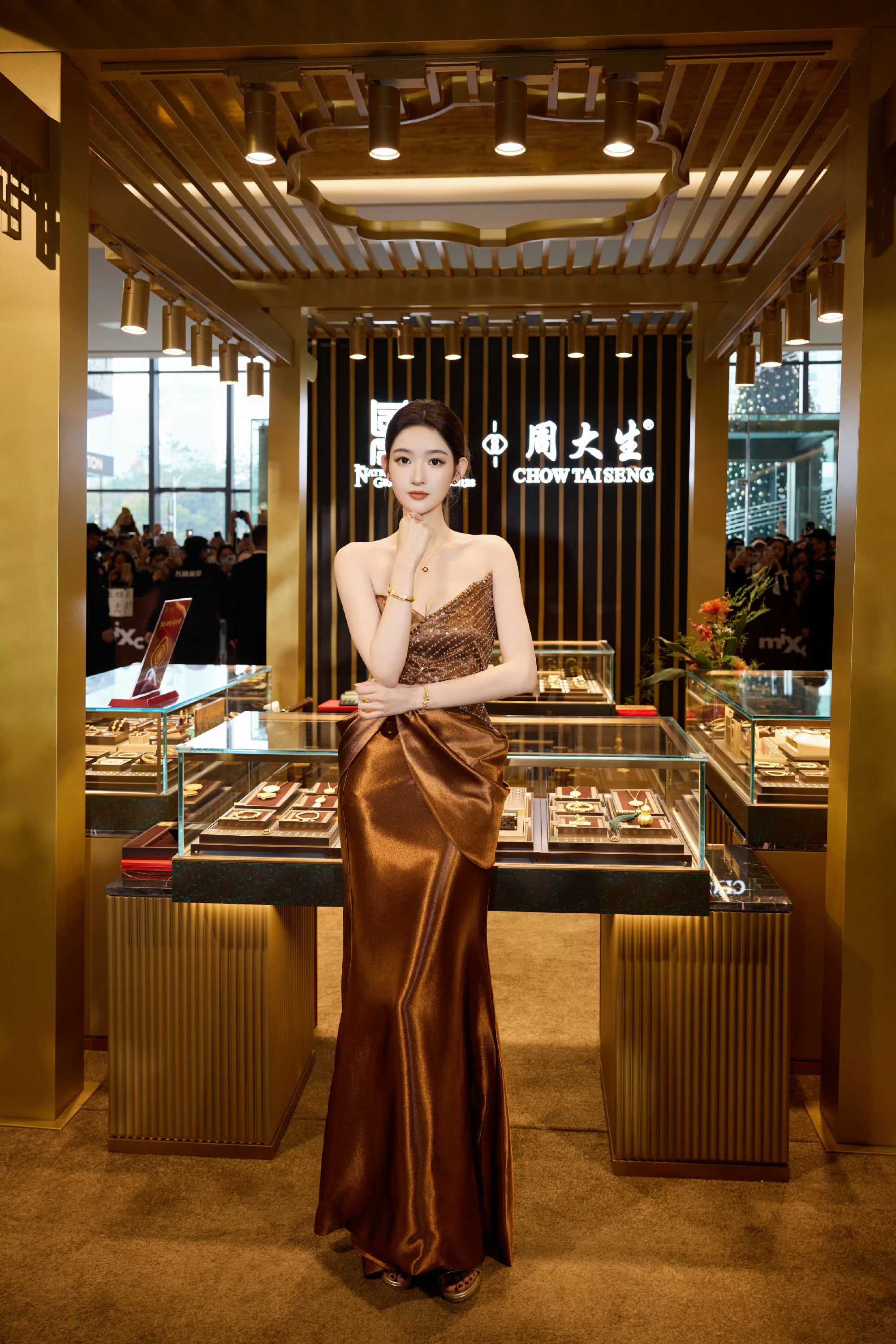 在周大生活动中,王玉雯身着一袭棕金斜肩礼裙,流光缎面与细碎钻饰交相辉映,勾勒出利落又柔媚的肩颈线条。