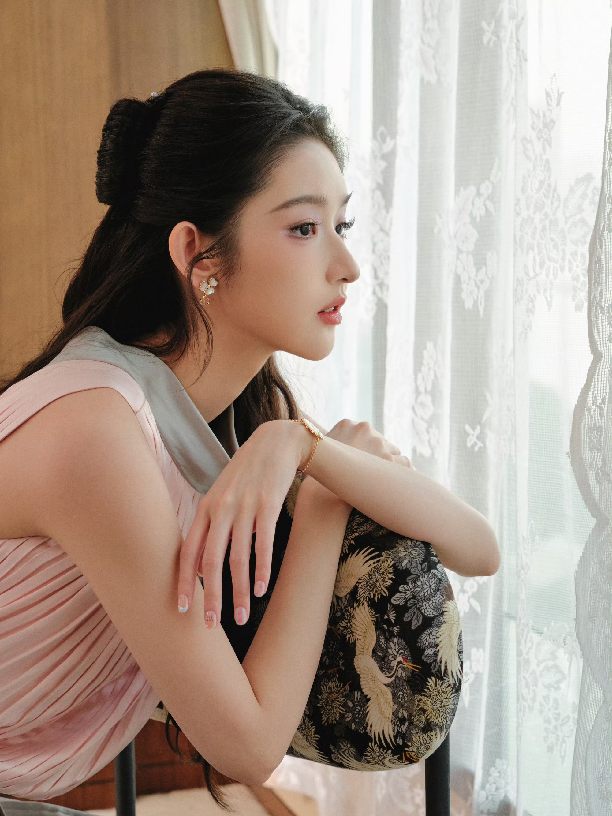暖光透过窗棂洒在她身上,淡然疏离中混着几分慵懒,像一幅被时光温柔晕染的画,干净又高级,将清冷与温婉的平衡感拿捏得恰到好处。
