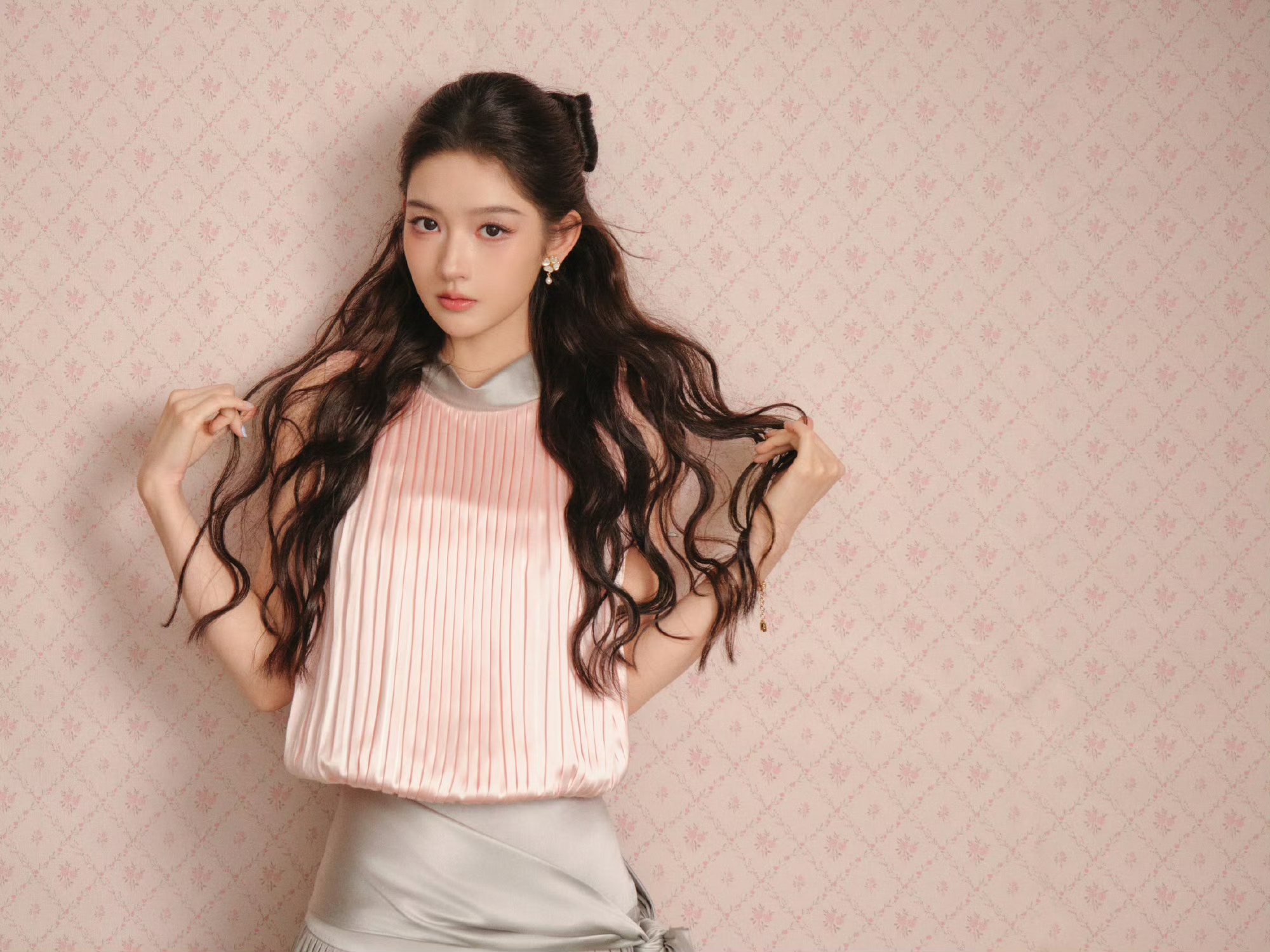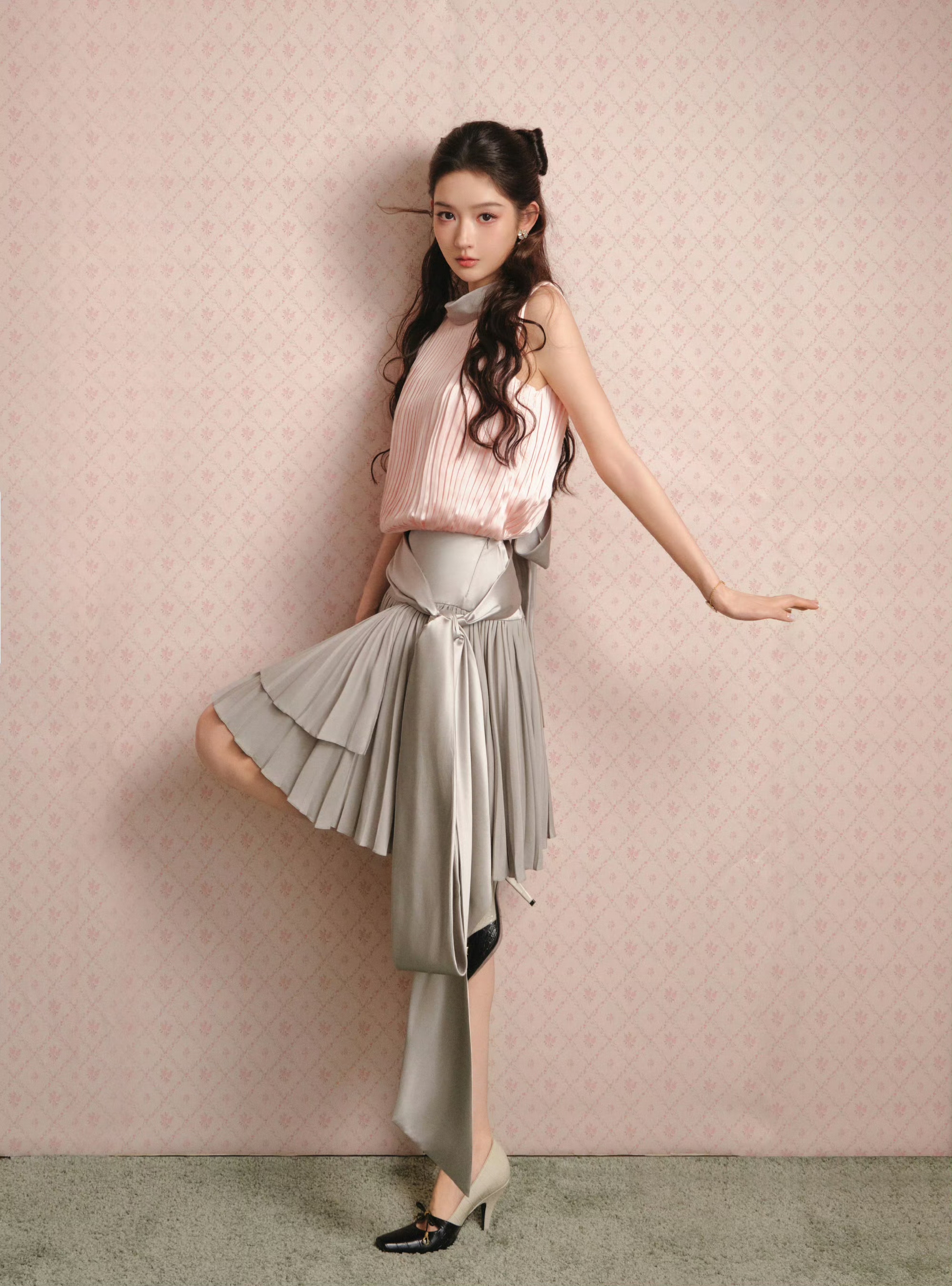 微卷长发自然散落,搭配精致耳饰与玛丽珍鞋,在粉色碎花墙前,她眉眼弯弯,甜而不腻的少女感扑面而来,完美诠释了“可盐可甜”的风格张力。