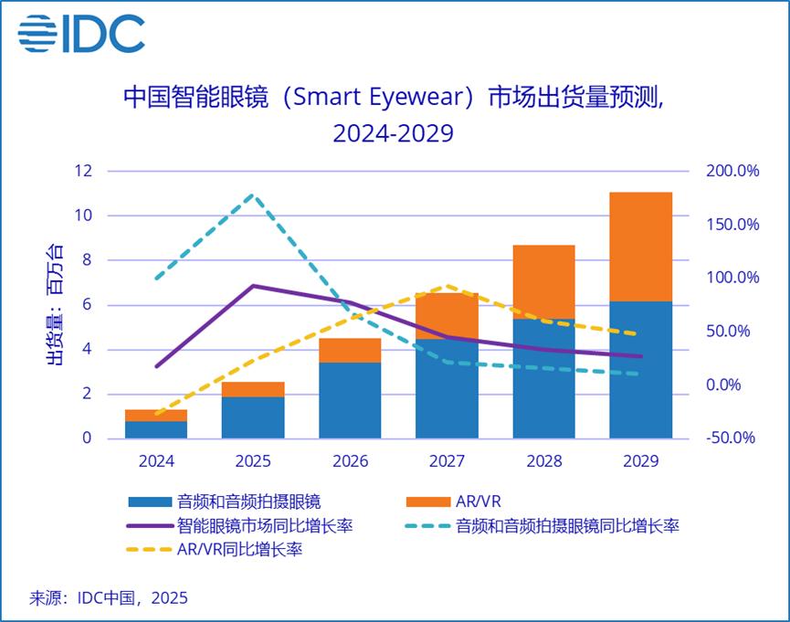 结合行业趋势来看,雷鸟切入智能眼镜赛道颇有见地。因为随着AI技术逐渐成熟,智能眼镜的出货量正飞速攀升。IDC显示,2025年Q3,中国智能眼镜市场出货量62.3万台,同比增长62.3%。预计2026年,中国智能眼镜市场出货量将达450.8万台,同比增长77.7%。