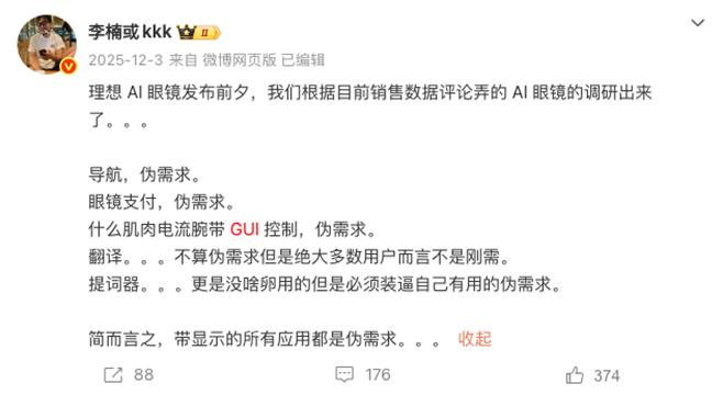 2025年12月,前魅族科技高级副总裁、Angry Miao创始人李楠在社交媒体平台披露了根据销售数据评论进行的AI眼镜调研,结果显示,导航、眼镜支付、肌肉电流腕带GUI控制、翻译均为伪需求,“简而言之,带显示的所有应用都是伪需求。”