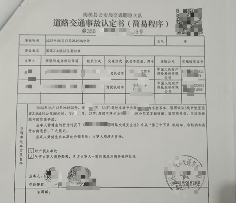 2023年6月15日,闽侯县公安单位交通执法大队出具《道路交通事故认定书》,认定事故时间为当日6时28分许,地点在国道316线93公里50米处。认定书以黄先生违反《道路交通安全法》第三十五条“右侧通行”规定,判定其负全责,郑某无责。虽认定书注明伤势轻微且各方同意简易程序,黄先生与郑某均签字,但事后黄先生满心委屈:当时他手里没有证据,既未拍摄现场照片,也未留存视频,仅向执法人员林某浩口头陈述事故全过程,并提交了书面报告,却未被采纳;林某浩在他无证据时直接认定其全责,他无奈之下才签字,且右侧施工本就无法正常通行,责任却由他承担,定责明显不公。