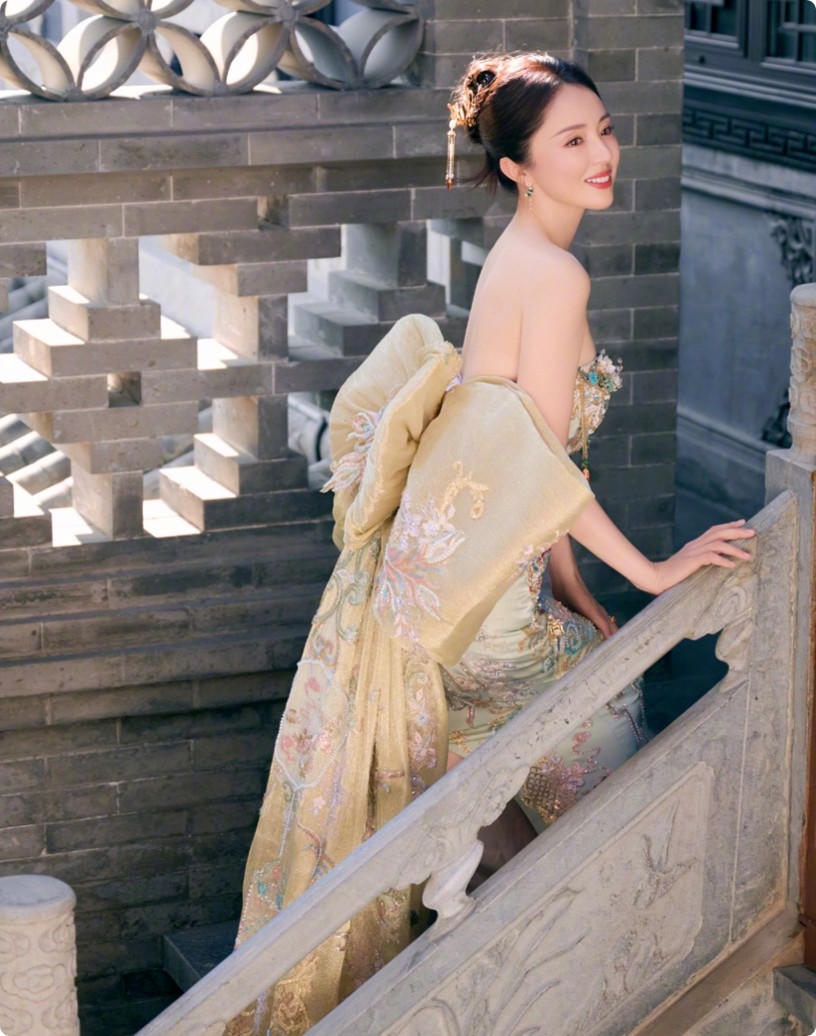 中式礼服为香槟金色,颜色鲜艳喜庆,映衬出她的肤色白皙透亮,肩颈线条流畅,端庄又大气。