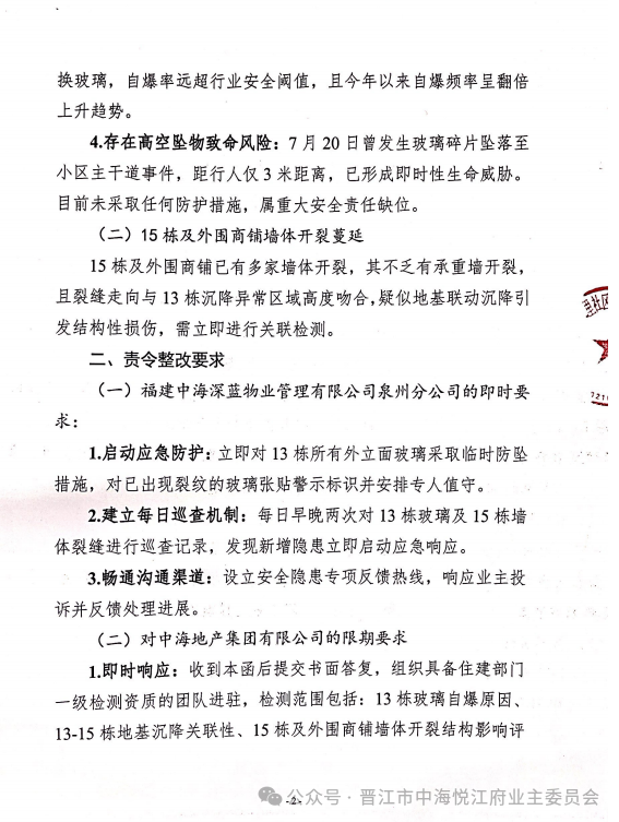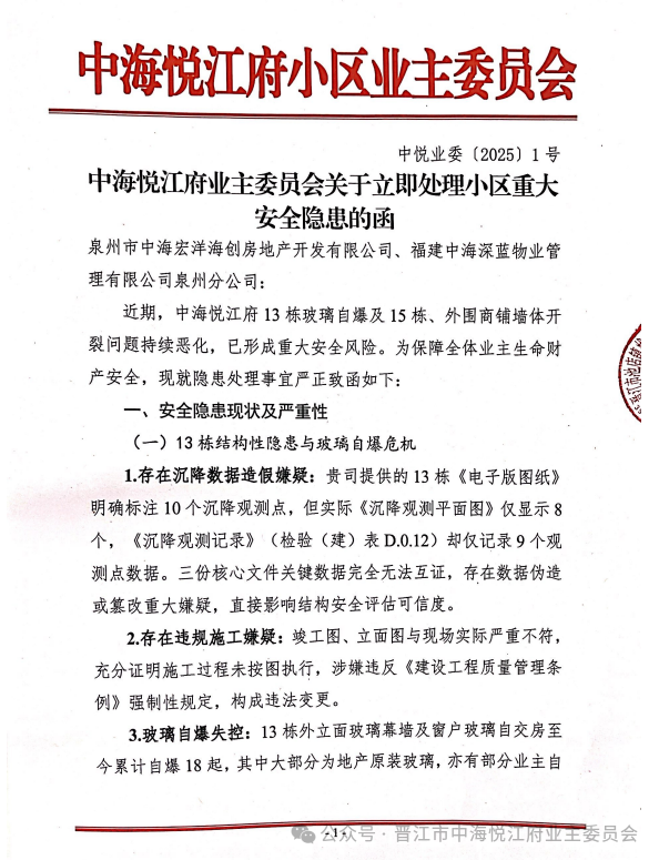 无独有偶,晋江又住宅小区也发生该类事情。2025年8月20日,中海悦江府业主委员会发布“关于立即处理小区重大安全隐患的函”:近期,中海悦江府13栋玻璃自爆及15栋、外围商铺墙体开裂问题持续恶化,已形成重大安全风险,为保障全体业主生命财产安全,现就隐患处理事宜严正致函中海地产和物业。而此事处理结果如何,我们不得而知。