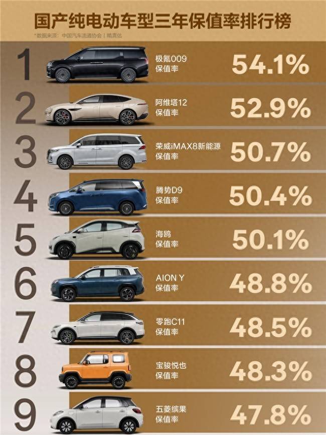 国产纯电三年保值率前9车型全展示!