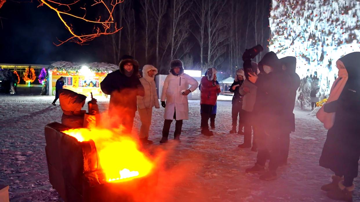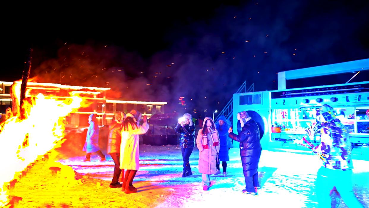 1、盛典尾声,篝火晚会、烟花秀与DJ秀场同步开启,将现场的欢乐气氛推向高潮。游客们围绕篝火打卡拍照,银装素裹的冰雪世界,瞬间变成了热情澎湃的狂欢派对。