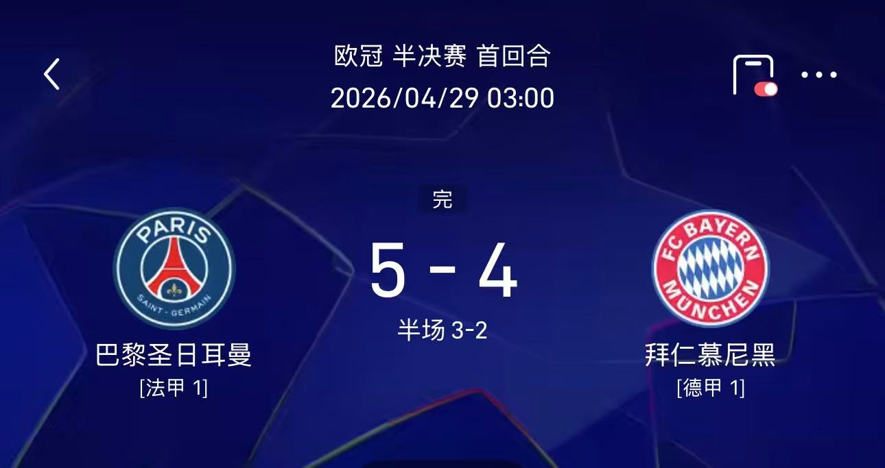 虽然巴黎赢下首回合,但5-4的比分意味着他们只有一球优势。次回合比赛将在5月7日凌晨移师拜仁主场安联球场进行。